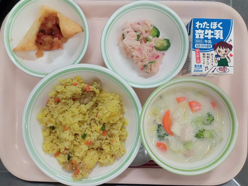焼肉チャーハン ししゃもフライ わかめトックスープ 梨 牛乳