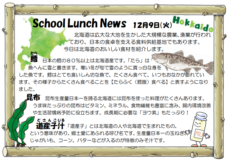 麦ごはん 昆布の佃煮 たらの南蛮漬け 道産子汁 牛乳