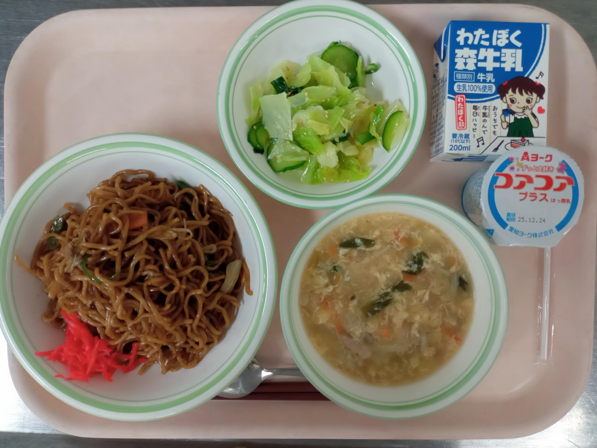 焼きそば(紅しょうが) 野菜とたまごの中華スープ やみつきキャベツ ヨーグルト 牛乳