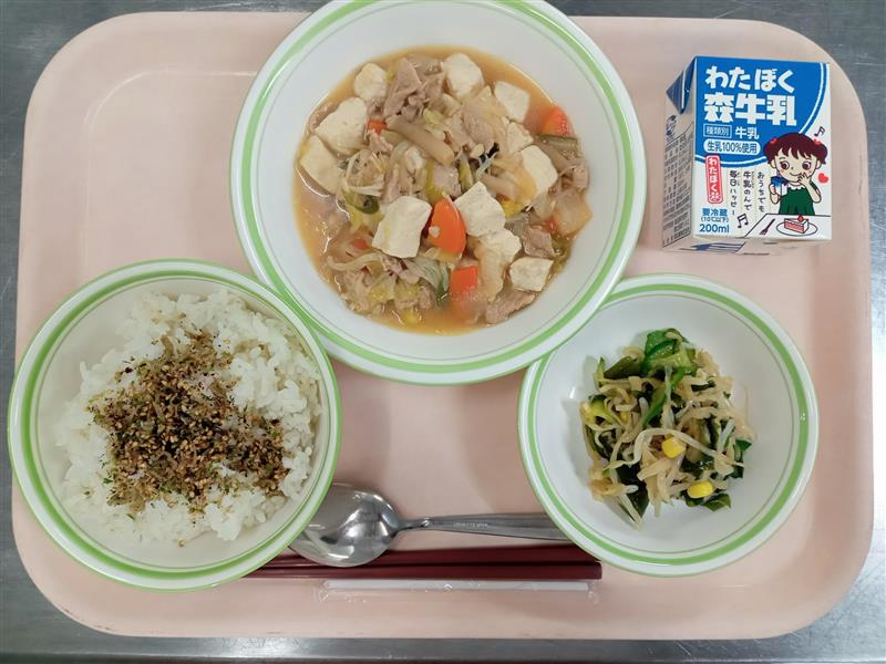 麦ごはん じゃこゆかりふりかけ 肉豆腐 和風サラダ 牛乳