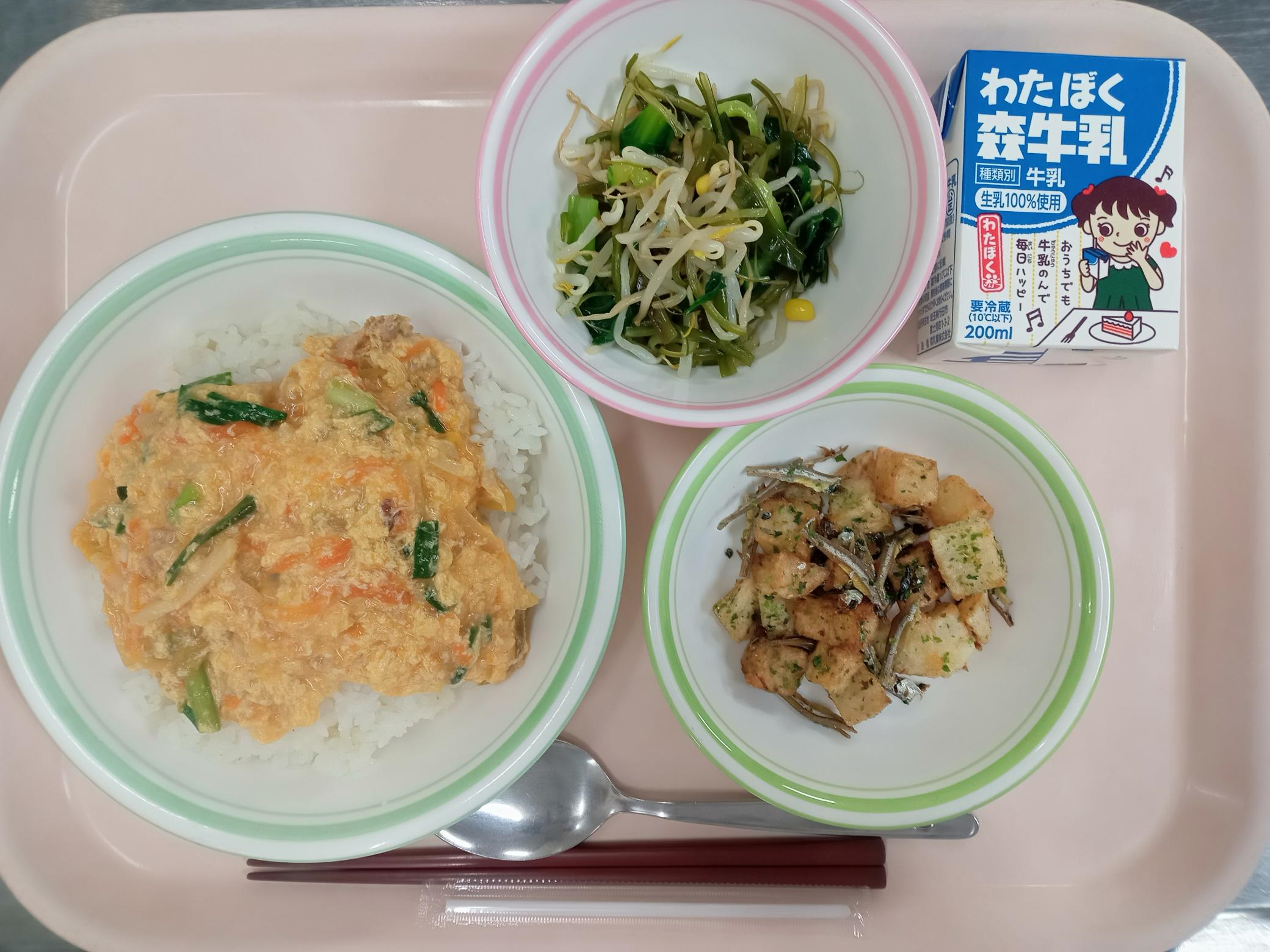 たまご丼(麦ごはん) 大豆と根菜のからあげ 磯香和え 牛乳