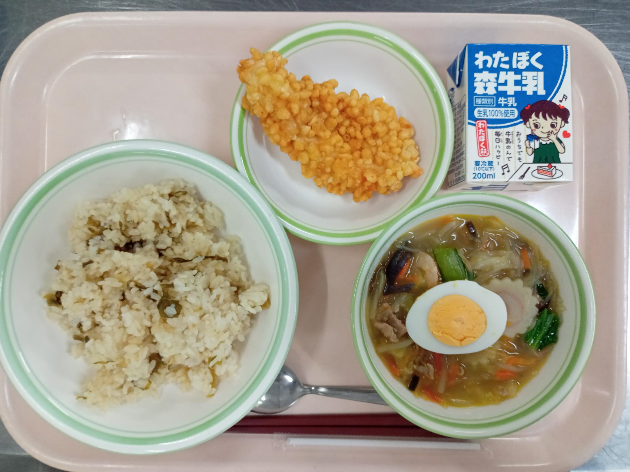 高菜ごはん サクサク鶏天 タイピーエン 牛乳