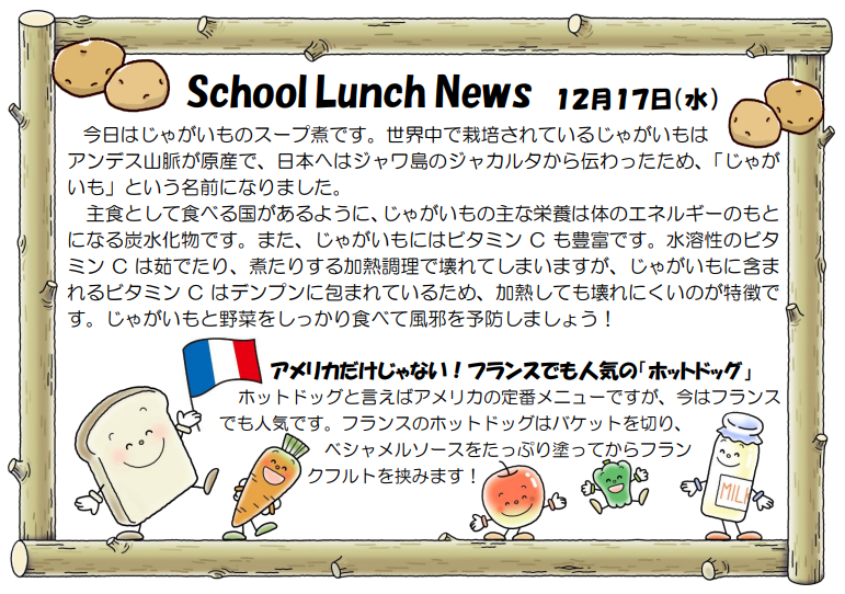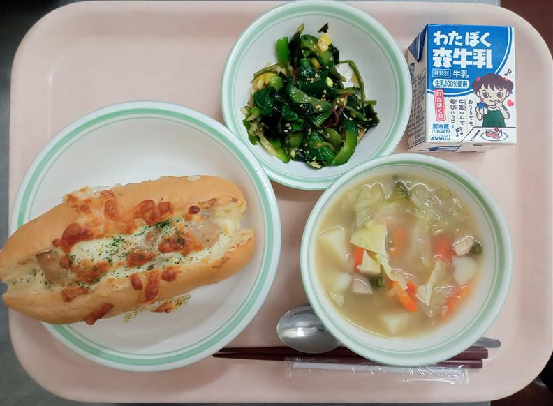 フレンチホットドッグ(ソフトフランスパン) じゃがいものスープ煮 海藻サラダ 牛乳