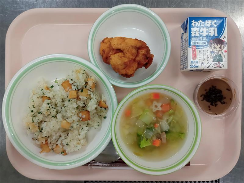 秋の香りごはん さわらの竜田揚げ すまし汁 牛乳