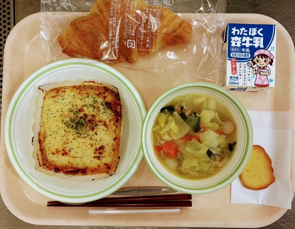クロワッサン アッシパルマンティエ(ポテトグラタン) ガルビュールスープ 手作りラングドシャ 牛乳