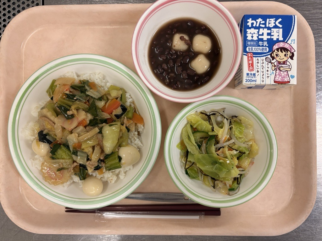 うま煮丼(麦ごはん) 塩昆布和え 白玉ぜんざい 牛乳