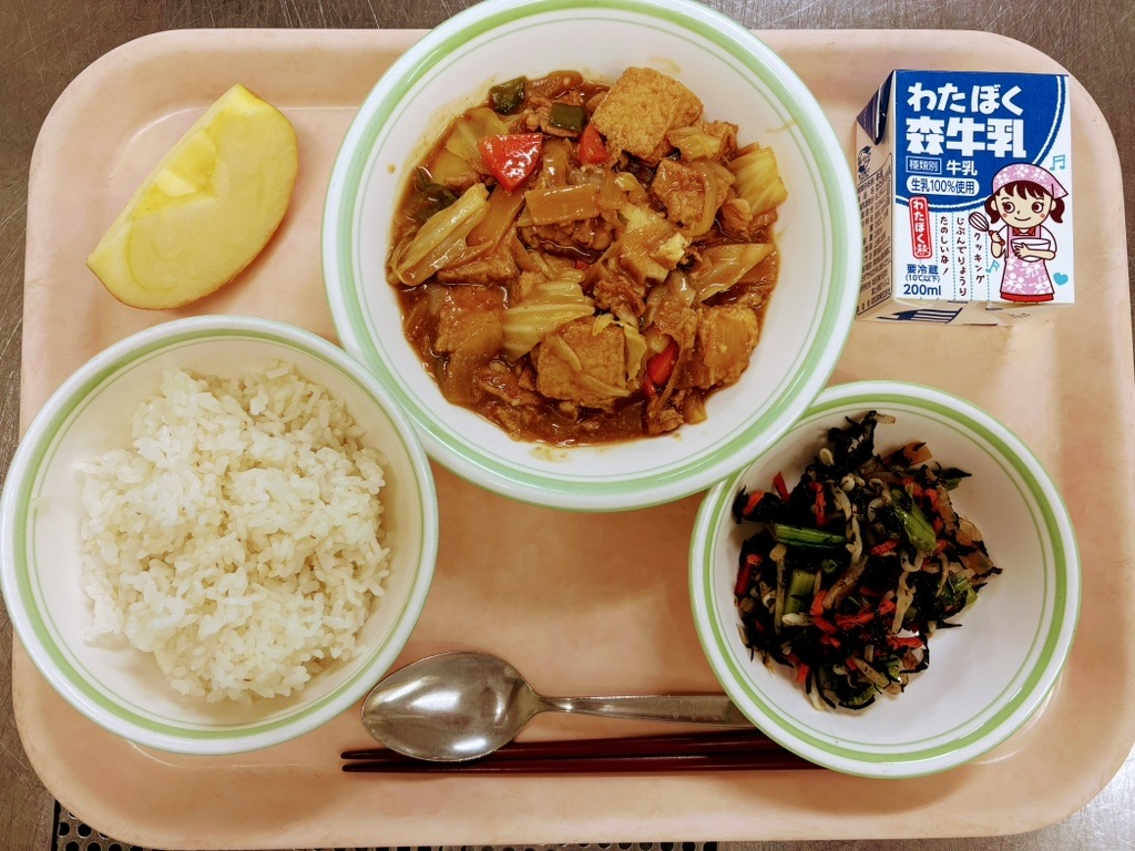 麦ごはん 豚肉と生揚げのゆずみそ煮 磯香和え りんご 牛乳